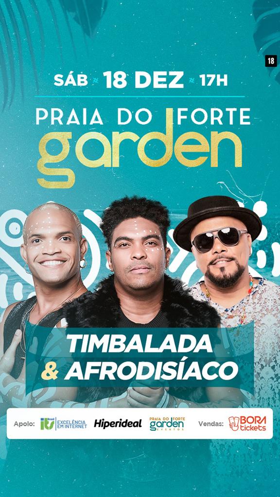 No dia 18 de dezembro, todos os caminhos levam à Praia do Forte. Em clima praiano e pé na areia, será realizada a 1ª edição do Garden Sessions, com shows das bandas Timbalada e Afrodisíaco. A festa será realizada a partir das 17h, no Praia do Forte Garden – mais novo espaço de eventos situado no balneário paradisíaco do Litoral Norte. De acordo com a organização, os ingressos são limitados e os portões serão abertos rigorosamente às 17h. Vendas pelo Bora Tickets.