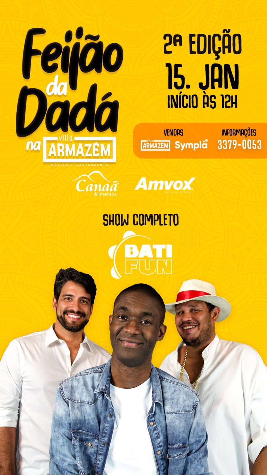 As banda Batifun liderada pelos cantores Junior Batifun, Marcelo Timbó e Fernando Rufino, iniciaram os trabalhos, a partir das 12h e o público além de degustar uma deliciosa feijoada, vão poder apreciar a apresentação musical desses talentosos cantores que fará um repertório de samba eclético e com os hits da atualidade e promete colocar todo mundo sambar. Afinal de contas são mais de 23 anos de sucesso na Bahia levantando e enaltecendo esse gênero que não deixa ninguém parado.
