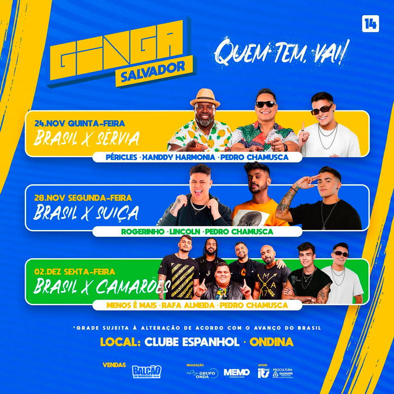 A Ginga Salvador fará as transmissões de todos os jogos do Brasil na primeira fase, oitavas, quartas, semifinal e da final, com uma super line up. Os ingressos – individuais e passaporte – estão à venda no Guichê Web, Balcões de ingresso e Pida! Confira a programação completa.