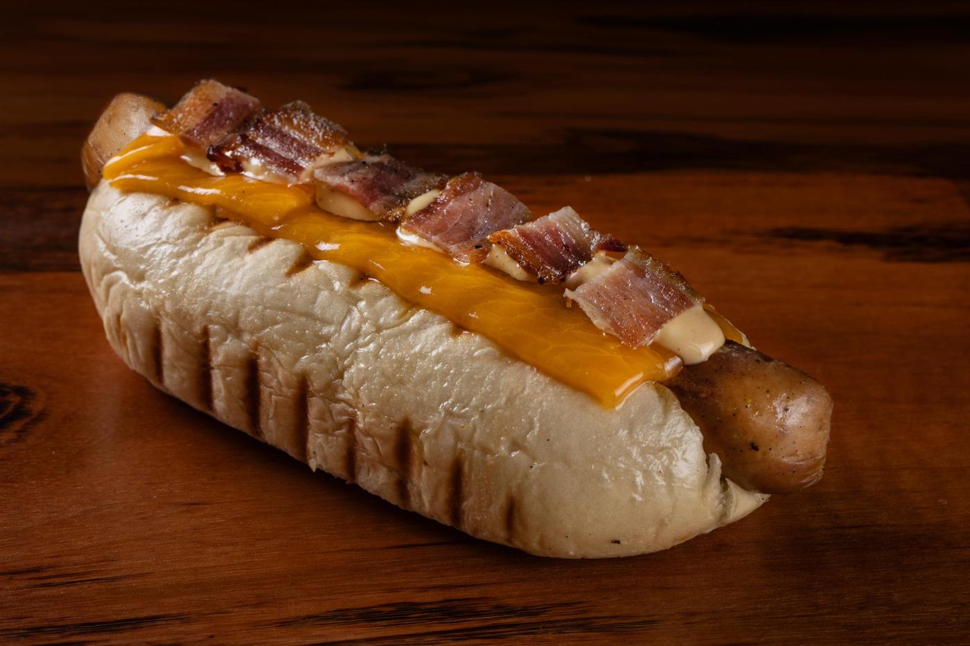 Hot Original: Salsicha da casa, cheddar inglês original, maionese supreme, bacon artesanal e cebola roxa na chapa!