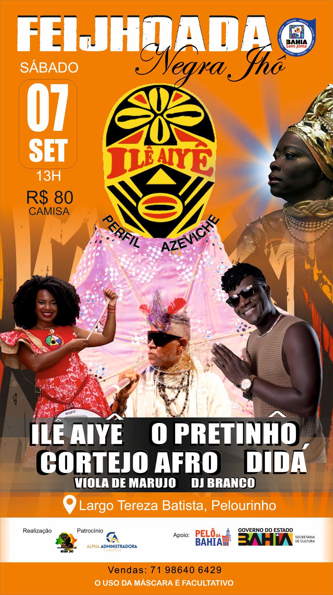 A “13ª edição da Feijoada de Negra Jhô” tem a finalidade de celebrar os 50 anos de Blocos Afros e a diversidade cultura da Bahia, confirmada com as belíssimas atrações como: Cortejo Afro, Ilê Aiyê, O Pretinho, Banda Didá, Dj Branco e Viola de Marujo, mais participações especiais. Como todos os anos, condessa de ébano vai desfilar pelas ruas do Pelourinho com uma corte africana que vai sair a partir das 13:30 da rua Frei Vicente N 04, ao som da banda percussiva e feminina Didá. O tema escolhido para este ano, será uma exaltação aos os caboclos brasileiro com um corpo de bailarinos e artistas convidados fazendona reverência as encruzilhadas. Os ingressos custam o valor promocional de R$ 80 (individual) até o dia 15/08, e já podem ser adquiridas lá no Salão da Negra Jhô, que fica na Rua das Laranjeiras , N° 10, (Perto de Alaíde do feijão)., no Centro Histórico de Salvador.