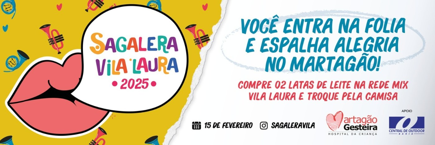 A Central de Outdoor Seccional Bahia é uma das apoiadoras do Sagalera Vila Laura, uma festa carnavalesca com viés solidário que acontece neste sábado (15), às 16h, no bairro de Vila Laura. No evento, a cada compra de duas latas de leite em um supermercado da região, o cliente ganha um abadá.