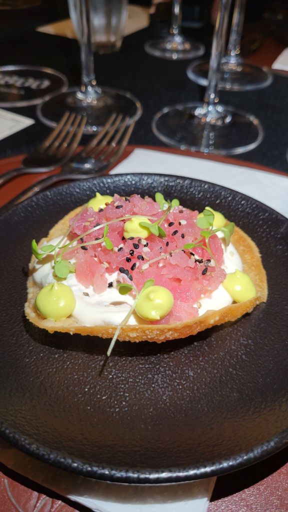 Para começar, uma degustação de tostada de atum, com tortilha crocante, straciatella,