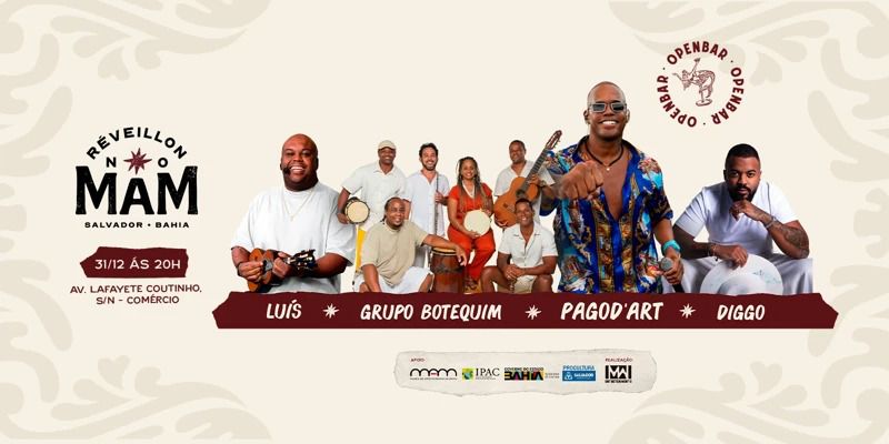 O evento acontece no dia 31 de dezembro, no Museu de Arte Moderna da Bahia (MAM-BA), e reúne atrações como Pagod’art, Diggo, Grupo Botequim e Luis. Com os setores Arena Open Bar e Camarote Open Bar, a festa combina estrutura completa, serviços inclusos e uma vista privilegiada para a Baía de Todos-os-Santos.