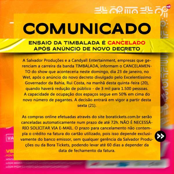 A Salvador Produções e a Candyall Entertainment, empresas que gerenciam a carreira da banda TIMBALADA, informam o *CANCELAMENTO* do show que aconteceria neste domingo, dia 23 de janeiro, no Wet, após o anúncio do novo decreto divulgado pelo Excelentíssimo Governador da Bahia, Rui Costa, na manhã desta quinta-feira (20), quando haverá redução de público -... Continuar Lendo →