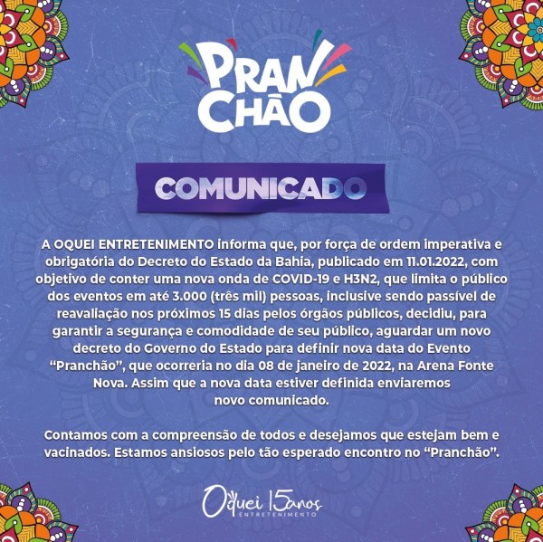 A OQUEI ENTRETENIMENTO informa que, por força de ordem imperativa e obrigatória do Decreto do Estado da Bahia, publicado em 11.01.2022, com objetivo de conter uma nova onda de COVID-19 e H3N2, que limita o público dos eventos em até 3.000 (três mil) pessoas, inclusive sendo passível de reavaliação nos próximos 15 dias pelos órgãos... Continuar Lendo →