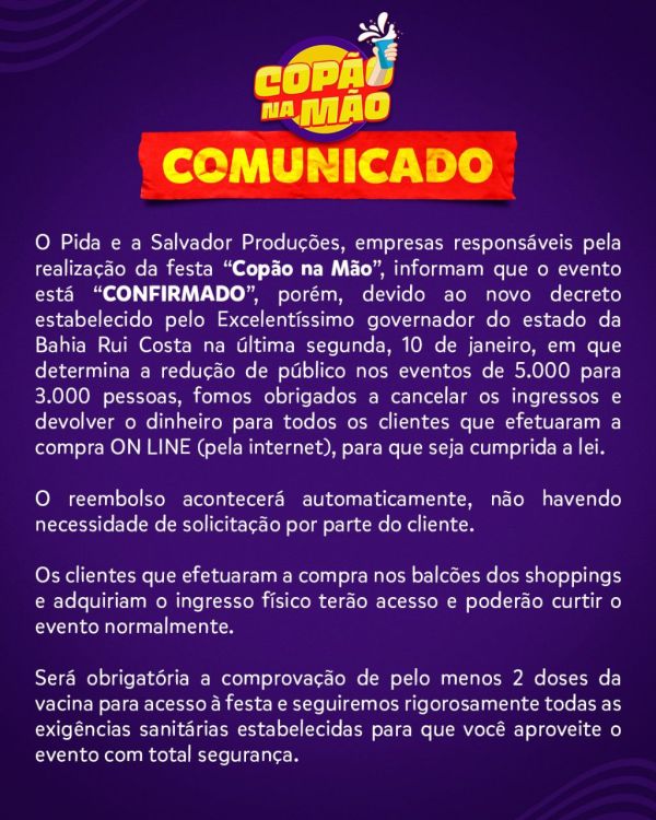 O Pida e a Salvador Produções, empresas responsáveis pela realização da festa “Copão na Mão”, informam que o evento está “CONFIRMADO”, porém, devido ao novo decreto estabelecido pelo Excelentíssimo governador do estado da Bahia Rui Costa na última segunda, 10 de janeiro, em que determina a redução de público nos eventos de 5.000 para 3.000... Continuar Lendo →