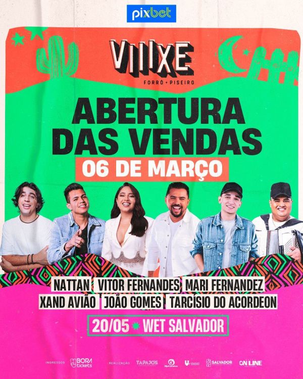 Festa reunirá grandes nomes do forró e piseiro em uma noite mágica no Wet SalvadorApós o sucesso da primeira edição, realizada em 2022 com ingressos esgotados, o Viiixe! Forró e Piseiro acabou de confirmar mais uma edição, no dia 20 de maio, no Wet Salvador e anunciou a abertura de vendas.Trazendo em sua grade, grandes... Continuar Lendo →
