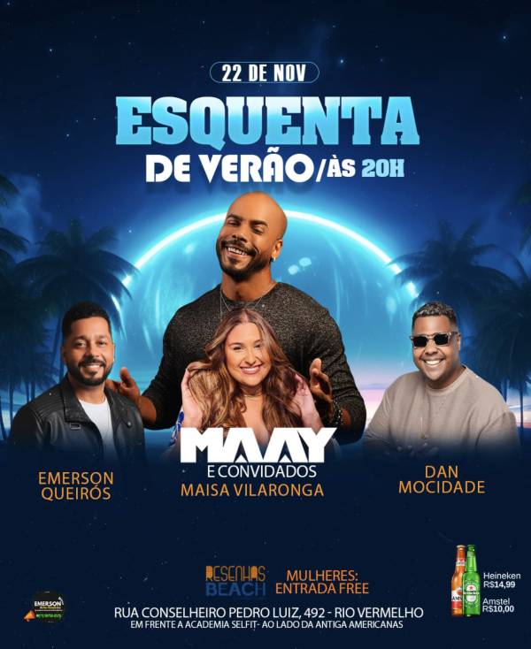 A casa abre às 20h e show contará com as participações especiais de Emerson Queiros, Maisa Vilaronga e Dan MocidadeO cantor Maay (Maylssonn) se apresenta com o seu projeto musical intitulado de 'Esquenta de Verão' neste sábado (22), no Resenha's Beach Bar e Restaurante a nova casa de entretenimento do Rio Vermelho, em Salvador. O... Continuar Lendo →